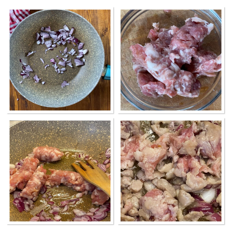 • Brate die Zwiebel in etwas Olivenöl an, füge die aus dem Darm gelöste Salsiccia hinzu und lasse sie kurz anbraten.