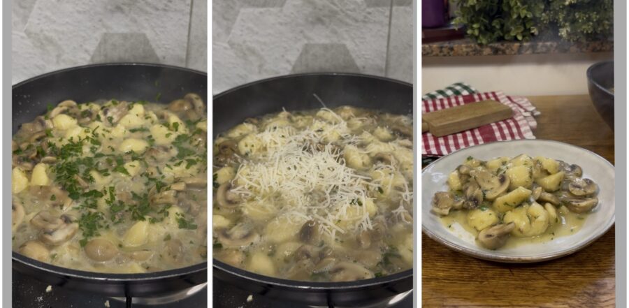 Gnocchi mit sautierten Pilzen, das cremige und umhüllende Rezept ganz ohne Sahne. Die Gnocchi mit sautierten Pilzen sind sicherlich ein Herbstrezept, aber auch ein preiswertes Gericht, das sich das ganze Jahr über einfach zubereiten lässt. Lecker und cremig — dieses schnelle und schmackhafte Gericht könnt ihr mit fertigen Gnocchi oder mit etwas mehr Geduld mit hausgemachten Kartoffelgnocchi zubereiten; ich habe in diesem Fall meine Gnocchi aus Wasser und Mehl (ohne Kartoffeln) verwendet. Ab in die Küche: Lasst uns gemeinsam dieses erste Gericht cremig, aber ohne Sahne, mit guter Butter, am besten hausgemacht zubereiten — und sagt mir dann, ob es nicht himmlisch ist! Pilzgerichte sind sowieso immer lecker: denkt an den Pilzsugo, die Lasagne mit Pilzen oder auch das klassische Pilzrisotto — auch aus dem Ofen! Genug geredet: Entdecken wir gemeinsam, wie man cremige Gnocchi mit Pilzen macht — hervorragend mit frischen Champignons oder Tiefkühlware, noch besser mit Steinpilzen oder fleischigeren Sorten wie Austernpilzen oder Cardoncelli. Übrigens: Wenn ihr über meine Rezepte auf dem Laufenden bleiben wollt, folgt meiner Facebook-Seite (hier), meinem Instagram-Profil (hier) und findet viele weitere in meinem Buch „Sizilien auf dem Tisch“.