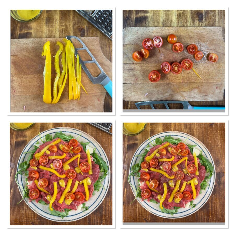 Schneidet die Paprika in dünne Streifen und halbiert die Cherrytomaten, nachdem ihr alles gewaschen und abgetropft habt. Verteilt das Gemüse über dem Fleisch, würzt mit Salz, Olivenöl und Pfeffer und serviert.