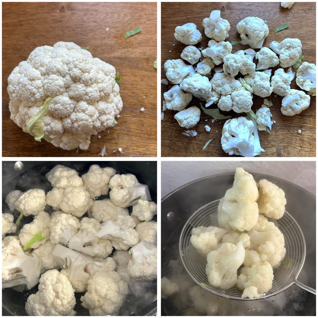 Reinigen Sie den Blumenkohl: Teilen Sie ihn in Röschen, spülen Sie diese ab und kochen Sie sie in reichlich leicht gesalzenem Wasser; lassen Sie sie noch bissfest abtropfen.