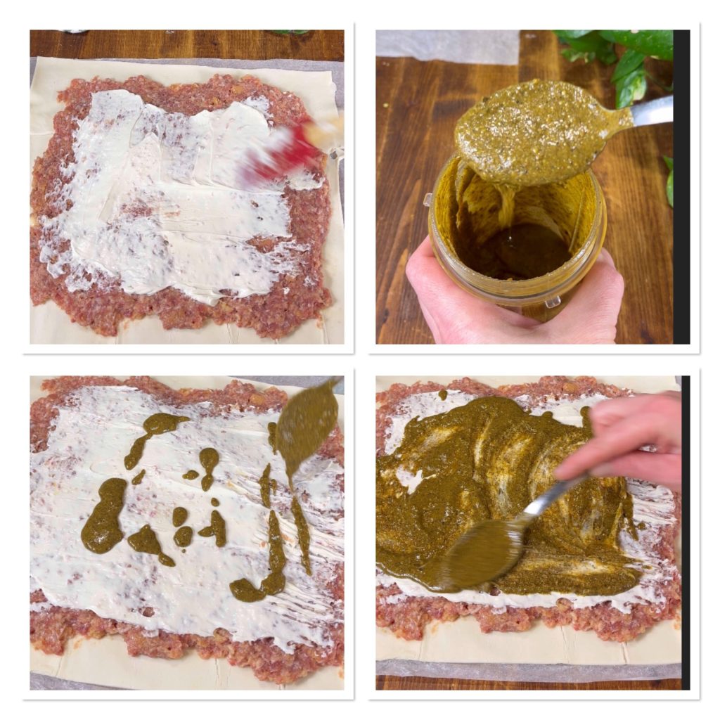 Rollt den Blätterteig aus. Ihr solltet eine größere Fläche erhalten, daher überlappt eine lange Seite eines Teigblattes leicht mit der langen Seite eines anderen, drückt die Kante mit den Fingern zusammen, so dass sie haftet, und schneidet dann von einer der beiden, an der langen Seite, etwa die Hälfte weg. Am Ende sollt ihr einen großen Teig erhalten, der etwa anderthalbmal so groß ist wie das Original. Verteilt die Hackfleischmasse darauf und lasst dabei rundherum 2 cm Rand frei.
