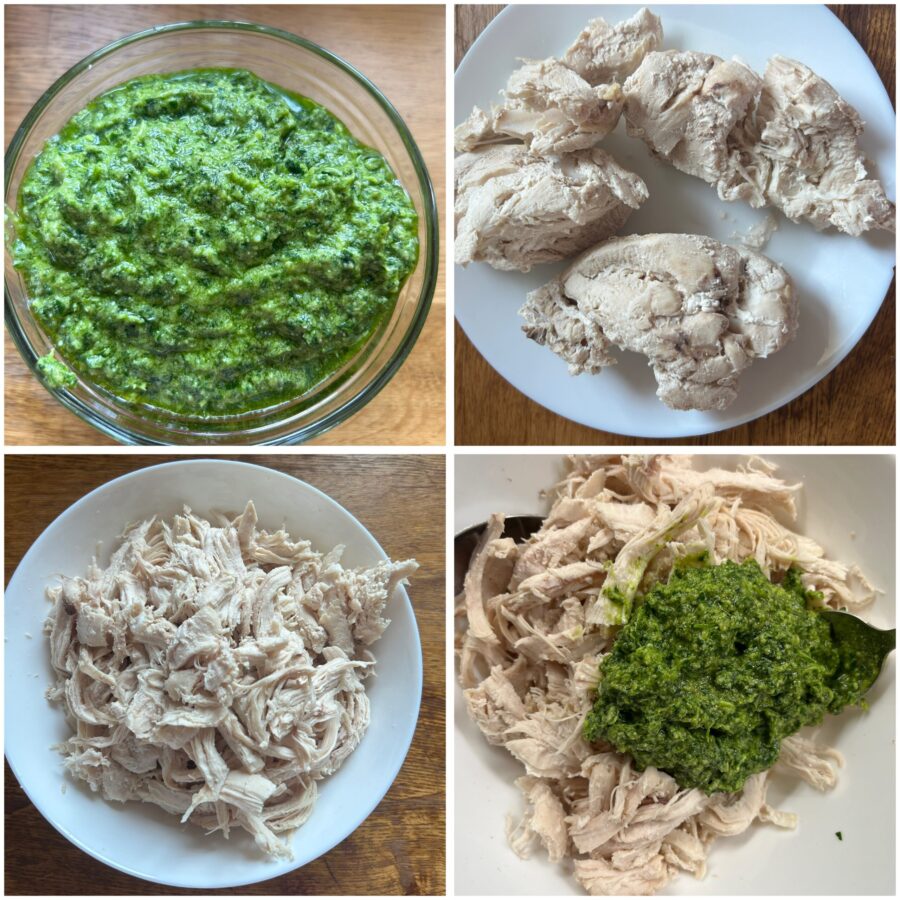 • Nachdem du die Hähnchenbrust in leicht gesalzenem Wasser gekocht hast (für eine ganze Brust, halbiert, reichen meist etwa 35 Minuten), gieße das Wasser ab und lass das Fleisch abkühlen. Sobald es kalt ist, zupfe es auseinander und gib es in eine große Schüssel. Vermische das Hähnchen dann gründlich mit der gesamten Sauce. Umrühren — fertig: Unser frischer und aromatischer gekochter Hähnchensalat ist servierbereit.