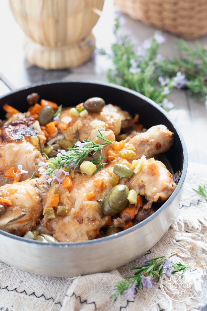 Hähnchen nach Jägerart (in Weiß) – Omas Rezept eines Klassikers der italienischen Küche, genau wie das Ganze Brathähnchen aus dem Ofen mit Kartoffeln. Das Hähnchen alla cacciatora ist eines der beliebtesten Fleischgerichte der italienischen Küche: einfach, aromatisch und leicht zuzubereiten. Es ist das klassische Sonntagsgericht, das Groß und Klein begeistert. Heute möchte ich euch jedoch eine etwas andere Variante des traditionellen Jägerhähnchens vorstellen – eine perfekte Alternative für alle, die keine Tomatensoße mögen, aber trotzdem viel Geschmack wünschen: das weiße Jägerhähnchen mit Oliven, so wie es meine Großmutter zubereitet hat. Natürlich bildet auch hier ein Soffritto aus Sellerie, Karotten und Zwiebeln die Basis, das zusammen mit den Kräutern dem Hähnchen seinen unverwechselbaren, köstlichen Geschmack verleiht. Ihr könnt dieses Rezept mit allen Teilen des Hähnchens zubereiten, aber ich habe Keulen und Oberschenkel gewählt, weil sie saftiger, fleischiger, zarter und schmackhafter sind und vor allem, weil meine Kinder diese Stücke am liebsten mögen! Nun ab in die Küche: ich bin sicher, Omas Rezept des weißen Jägerhähnchens mit Oliven wird euch schon beim ersten Bissen überzeugen, und ich wette, niemand wird auf das finale Tunken in der leckeren, aromatischen Sauce verzichten wollen. Außerdem ist dies auch ein tolles Rezept, um Hähnchen im Topf zu garen! Falls das Jägerhähnchen zwar lecker ist, aber nicht das Gesuchte, und ihr andere Ideen zu Wie man Hähnchen zubereitet sucht, probiert die Hähnchenbrust mediterran mit Zwiebeln und getrockneten Tomaten, das Hähnchen in Bier im Bräter oder das Hähnchen aus dem Ofen mit Kartoffeln und Zwiebeln. Ab in die Küche — und bevor ihr startet: wenn ihr über alle meine Rezepte informiert bleiben wollt, folgt meiner Facebook-Seite (hier) und meinem Instagram-Profil (hier).