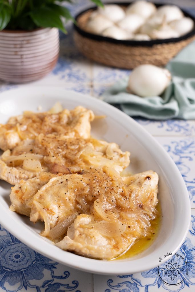 Hähnchenbrust mit Zwiebeln und Weißwein, sehr zart, dezent und cremig, ein Rezept, das zeigt, wie man Hähnchen zubereitet, damit es saftig und weich bleibt. Ein Rezept, das perfekt in unsere Sammlung mit Zwiebelrezepten passt. Wenn ihr genug vom üblichen gegrillten Hähnchenbrustfilet habt und eine kreative Idee für eine leckere Hähnchenbrust sucht, dann seid ihr hier richtig: heute bereiten wir zusammen Hähnchenschnitzel mit weißen Zwiebeln zu — cremig, fein und sehr zart, ein ebenso köstliches Gericht wie die Hähnchenschnitzel mit Zitrone oder die cremigen Hähnchenschnitzel mit Pilzen. Dieses Rezept für Hähnchenbrust in der Pfanne, damit sie saftig, sehr zart und lecker bleibt, stammt von meiner Cousine Linda: vor ein paar Tagen hat sie es zum Mittagessen gebracht und es hat mir so gut geschmeckt, dass ich es nachgekocht habe. Das Rezept für Hähnchenbrust mit Zwiebeln und Weißwein ist super einfach, schnell, preiswert und sehr lecker — die perfekte Lösung, um ein schnelles Abendessen in wenigen Minuten zu zaubern, zum Beispiel wenn ihr nach der Arbeit nach Hause kommt und noch keine Idee habt. Seid ihr bereit, in die Küche zu stürmen? Los geht’s, unser schnelles und leckeres Hähnchenrezept wartet auf uns. Übrigens: wenn ihr über all meine Rezepte auf dem Laufenden bleiben wollt, könnt ihr meiner Facebook-Seite (hier) und meinem Instagram-Profil (hier) folgen.