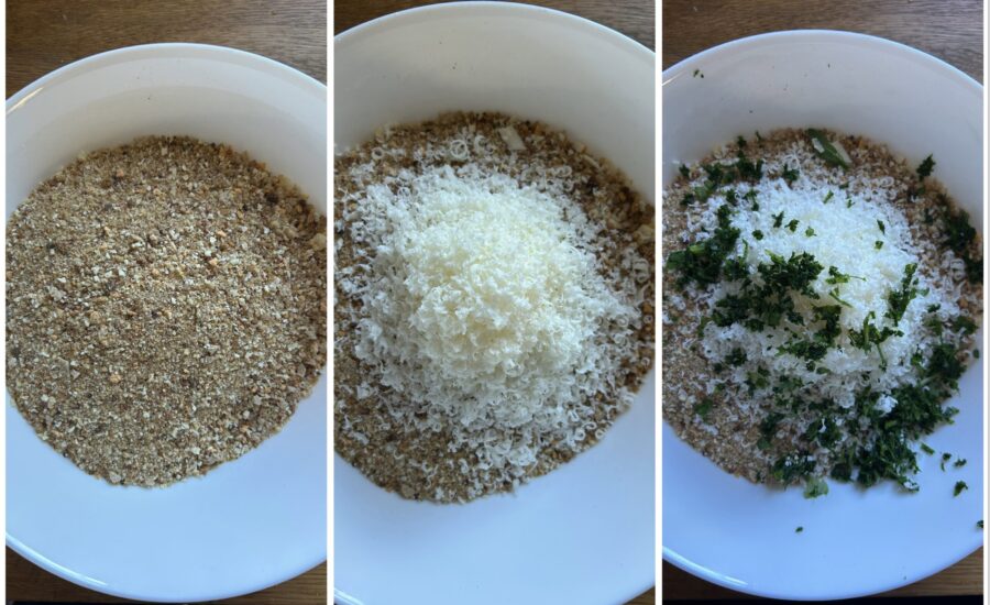 Während das Hähnchen im Zitronensaft und Öl mariniert, bereitet ihr die Panade vor: Gebt Paniermehl, geriebenen Käse, eine Prise Salz, gehackte Petersilie und auch eine Prise Knoblauchpulver oder frischen Knoblauch in eine Schüssel. Ich habe aus Bequemlichkeit das Pulver verwendet. Alles gut vermischen.