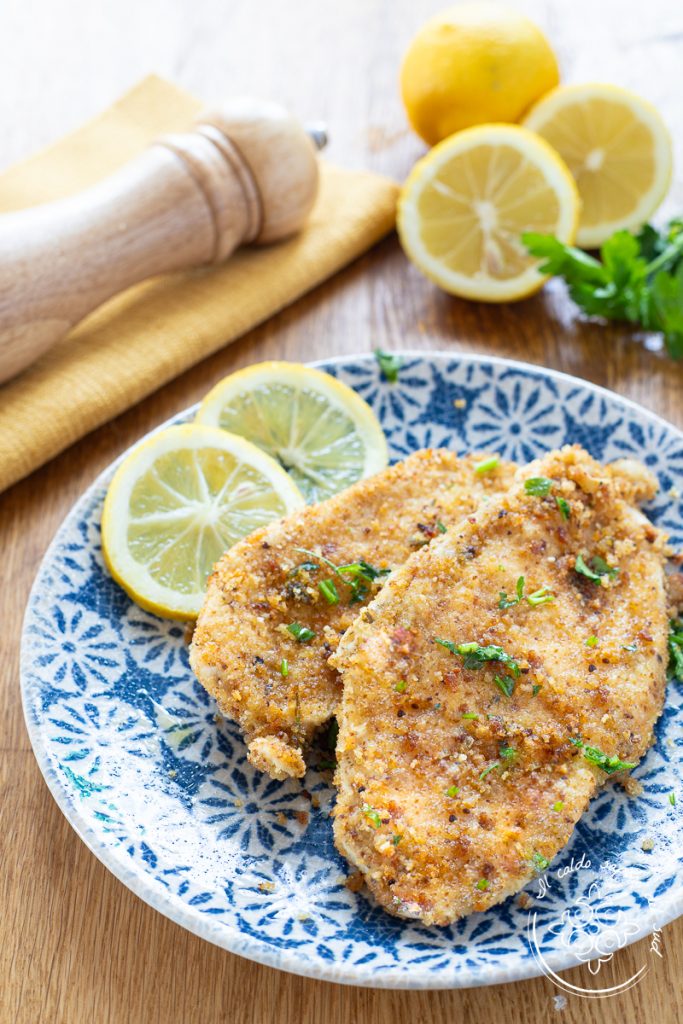 Zitronenhähnchenschnitzel aus der Heißluftfritteuse, ohne Ei und ohne Frittieren. Wie die Hähnchen-Nuggets aus der Heißluftfritteuse ist auch dieses Rezept wirklich sehr einfach, lecker und leicht und ideal, wenn ihr nach schnellen und raffinierten Hähnchenbrust-Rezepten sucht, die euch in wenigen Minuten das Abendessen retten. Dieses Hauptgericht ist in 10 Minuten vorbereitet und in 15 Minuten gegart. Um diese Hähnchenschnitzel in der Heißluftfritteuse innen zart und außen knusprig zu erhalten, empfehle ich, eine ganze Hähnchenbrust zu kaufen — sie ist günstiger und ihr könnt vor Ort entscheiden, wie ihr sie zubereiten wollt. In diesem Fall habe ich leichte Schnitzel ohne Ei gemacht, aber genauso gut hätte ich Bocconcini oder Straccetti oder auch Hähnchenfrikadellen mit Zitrone zubereiten können. Die Heißluftfritteuse ist als kleiner Umluftofen zu betrachten, daher könnt ihr, wenn ihr keine besitzt, auch den normalen Backofen verwenden und bei 200°C für 20 Minuten backen oder bis zur gewünschten Bräunung, dabei die Schnitzel zur Hälfte der Garzeit wenden. Wenn ihr traditionelle Schnitzel mögt, probiert die panierte Hähnchenschnitzel nach Omas Art oder die Hähnchenschnitzel mit Schinken und Käse. Ab in die Küche — unsere Hähnchenbrust wartet darauf, in ein leichtes und aromatisches Gericht verwandelt zu werden. Und bevor wir loslegen: Wenn ihr über alle meine Rezepte auf dem Laufenden bleiben wollt, folgt meiner Facebook-Seite und meinem Instagram-Profil. Hier findet ihr außerdem Wie man Schnitzel macht und viele weitere leckere Rezepte.