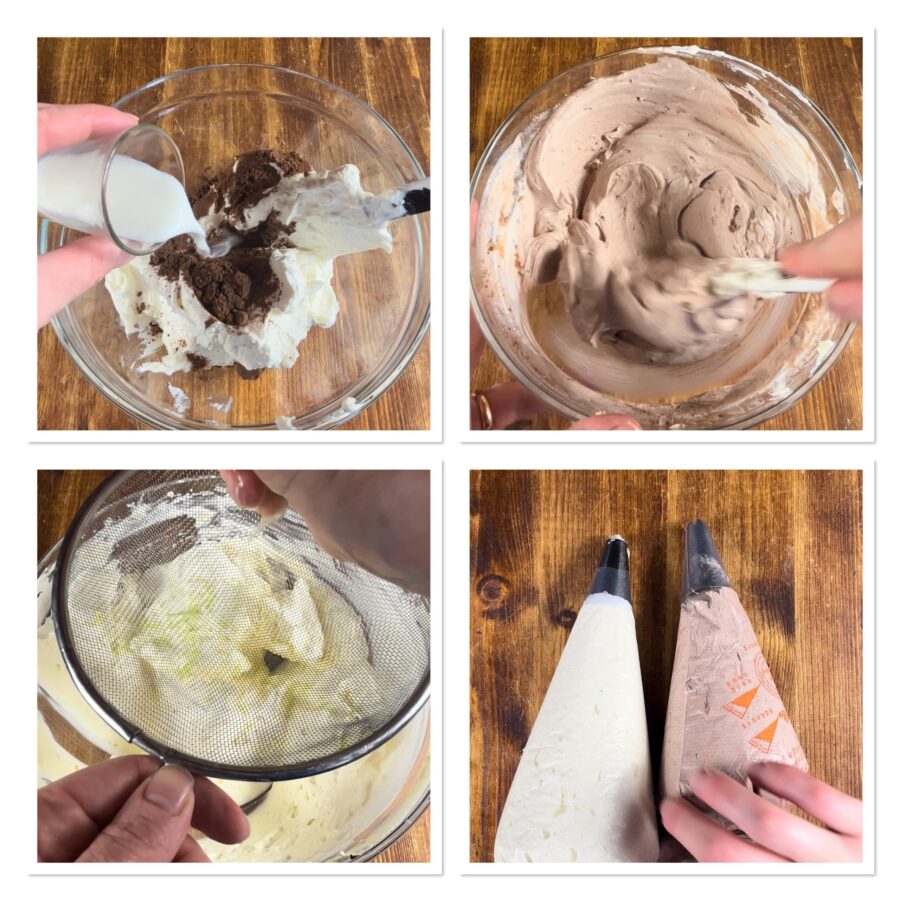 Nehmt ein Drittel der Mousse, gebt sie in eine Schüssel, fügt das Kakaopulver und die Milch hinzu und verrührt alles vorsichtig. Zur weißen Hälfte gebt ihr zwei Esslöffel Zitronensaft und die Zitronenschale. Falls sich die Masse während der Zubereitung erwärmt hat, empfehle ich, sie für 30 Minuten in den Gefrierschrank zu stellen.