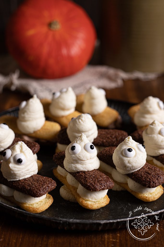 Halloween-Süßigkeiten mit Pavesini. Wollt ihr einfache Halloween-Leckereien ausprobieren, die ihr mit euren Kindern machen könnt? Probiert diese gruseligen Pavesini, die euch riesigen Spaß machen werden! Diese Halloween-Pralinen ohne Ofen und ohne Backen werden auf einer Basis aus ei-freier Mascarpone-Creme zubereitet, die sehr einfach ist und herrlich zitronig duftet, sowie mit einer ebenso einfachen Mascarpone-Kakao-Creme.