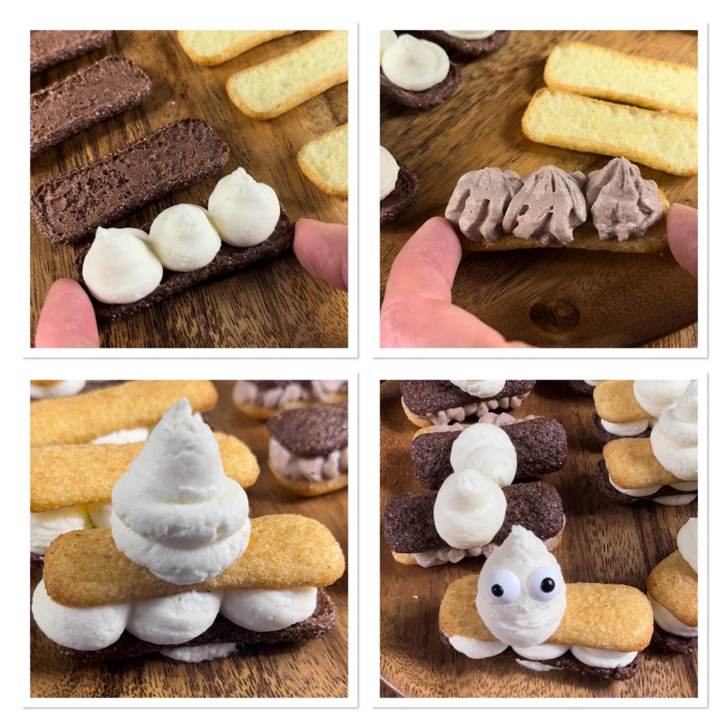 Füllt zwei Spritzbeutel mit den jeweiligen Cremes, macht kleine Sahnetuffs auf einem Tablett und setzt die Pavesini mit der inneren Seite nach oben darauf. Füllt sie mit den Mousses und deckt sie mit weiteren Pavesini ab. Auf jedes Paar spritzt ihr weiße Creme-Tuffs, setzt die Zuckeraugen auf – und fertig sind sie, zum Genießen nach 30 Minuten Ruhe im Gefrierschrank!