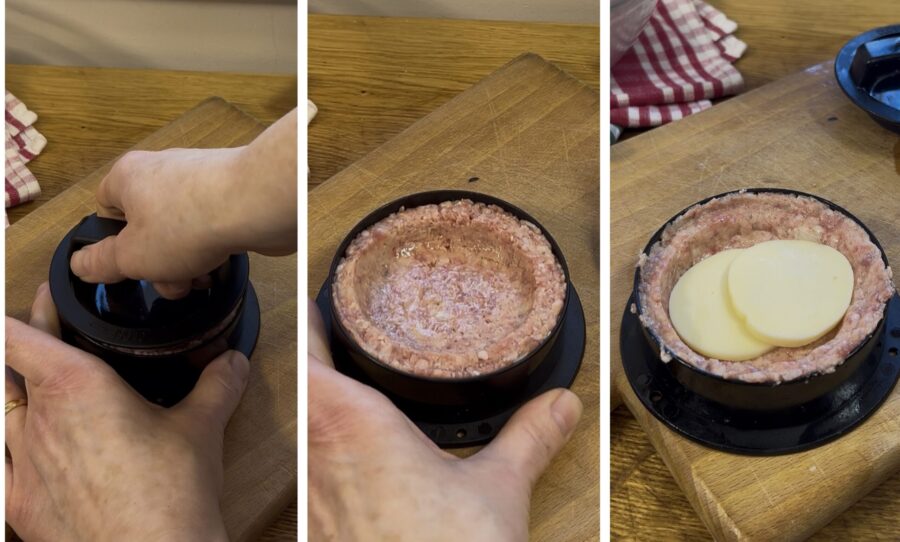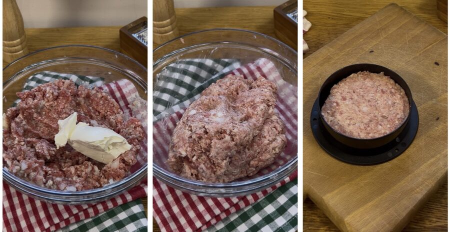 • Gebt den Frischkäse hinzu, der zusammen mit der Zwiebel die Burger sehr weich und schmackhaft macht. Vermengt die Masse gut und beginnt mit der Form, die erste Fleischscheibe zu formen.