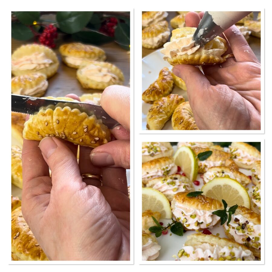 Schneide jede Muschel zur Hälfte ein, ohne ganz durchzuschneiden, so erhältst du die beiden Schalen einer Muschel. Fülle sie vollständig mit der vorbereiteten Creme und dekoriere mit gehackten Pistazien.