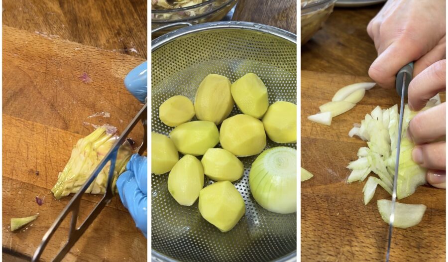 • Sind alle Herzen vorbereitet, schneidet sie in Scheiben und legt sie beiseite. Pellt und wascht Kartoffeln und Zwiebel, die Zwiebel fein hacken.