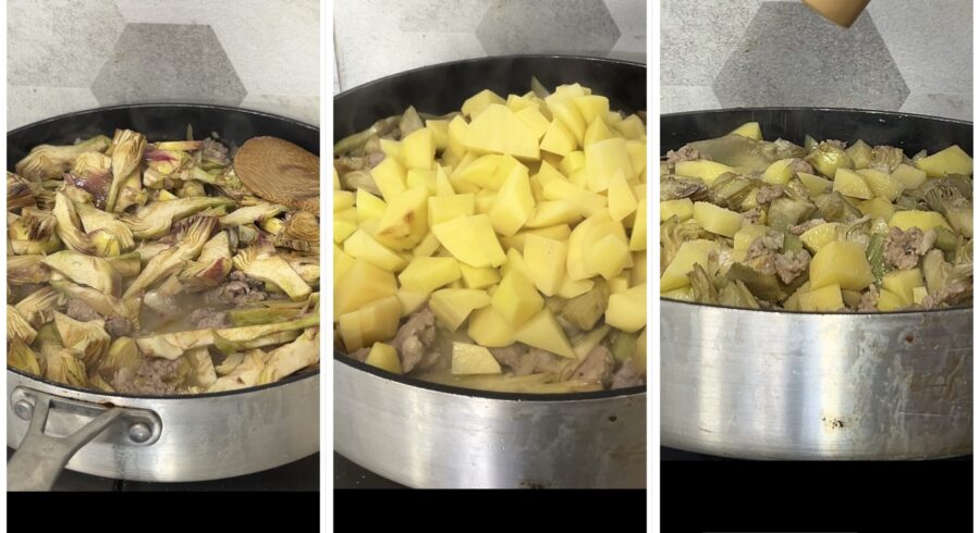 • Wenn der Alkohol des Weins verdampft ist, gebt die Artischockenherzen dazu, lasst alles kurz anziehen und gebt dann die Kartoffeln hinzu. Mit Salz und Pfeffer abschmecken, kurz bei hoher Hitze ziehen lassen, dann den Deckel auflegen und