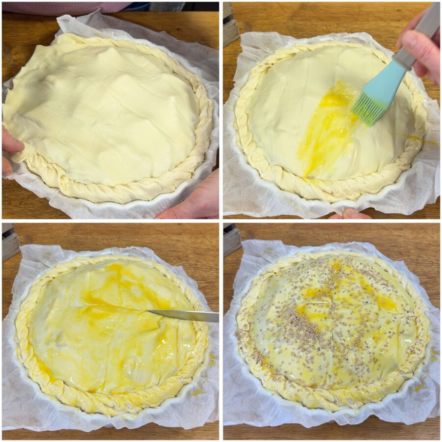 • Verschließt den Rand, indem ihr ihn zu einer Kordel formt. Mit verquirltem Ei bestreichen, einige Einschnitte in die Oberfläche machen, mit Sesam bestreuen und im vorgeheizten Ofen in statischer Funktion 45 Minuten bei 180°C backen. Achtet darauf, dass die Tarte auch am Boden gut durchbackt.