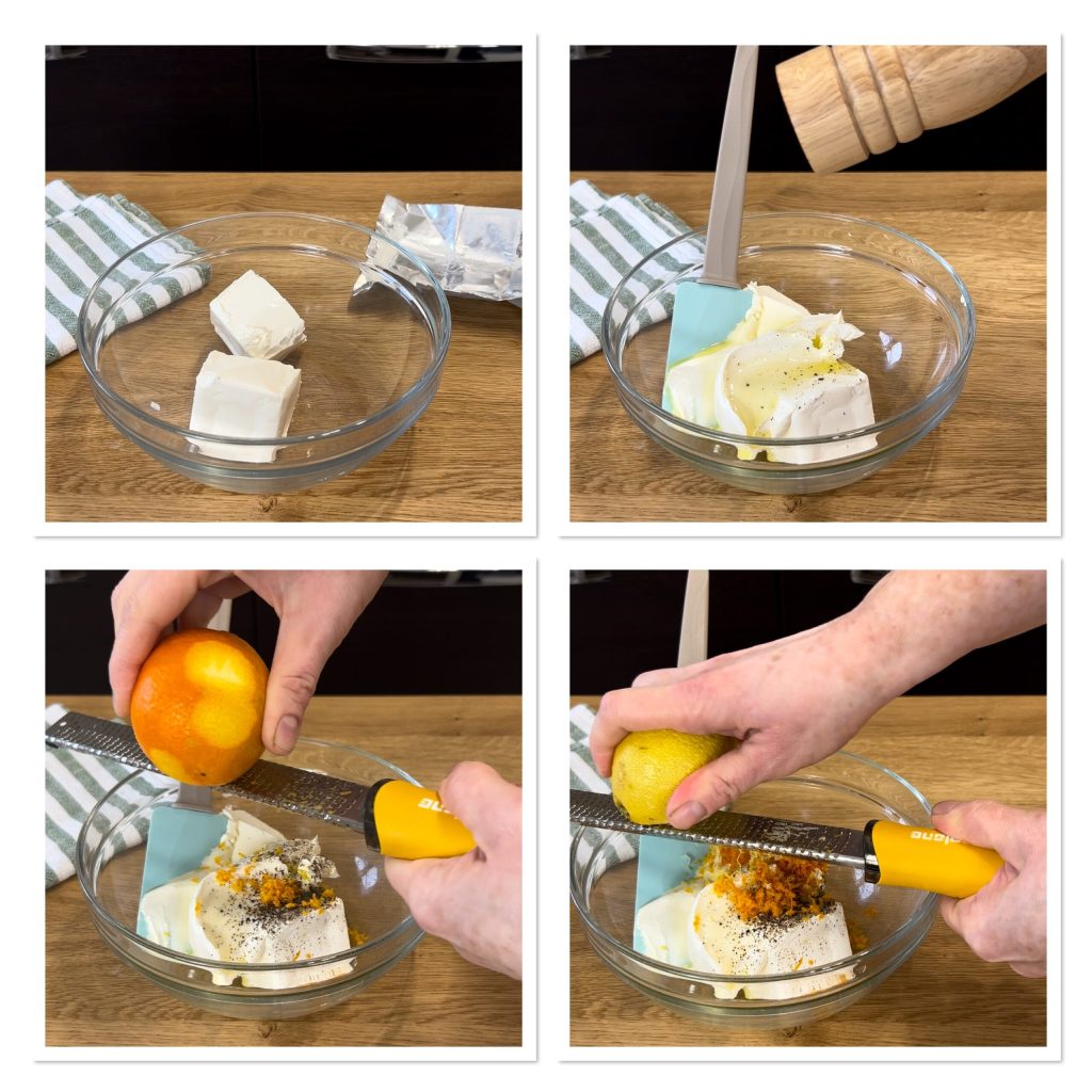 Gib Robiola und Mascarpone in eine Schüssel, füge Salz, Olivenöl, Petersilie, Orangensaft, Zitronensaft und die fein abgeriebene Schale beider Früchte hinzu.
