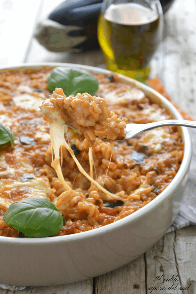 Im Ofen gebackener Reis mit Auberginen und Mozzarella