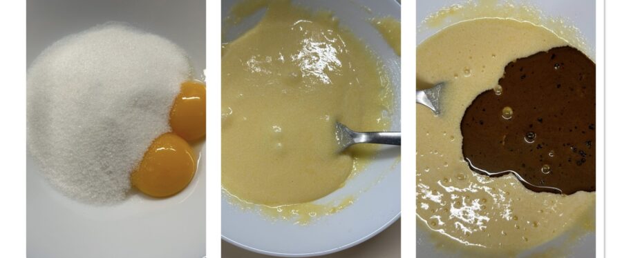 Um das Kaffee-Eis zuzubereiten, fangt damit an, die Eigelbe mit dem Zucker zu verquirlen (z. B. mit einer Gabel) und gebt dann den Espresso, gemischt mit Instantkaffee, dazu.