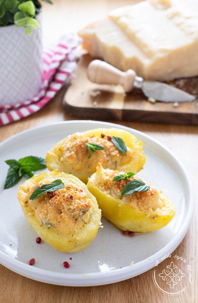 Käsegefüllte Kartoffel-Boote – genauso lecker wie die Kartoffel-Boote mit Thunfisch und Mayonnaise. Gefüllte Kartoffeln mit viel Grana Padano, ein köstliches und super einfaches Rezept, das euch mit nur ganz wenigen Zutaten das Abendessen rettet – genau wie die Kartoffel-Törtchen in Einzelportionen und die bisherigen Kartoffel-Boote. Ich bin mir ziemlich sicher, dass ihr zuhause die Zutaten habt, um diese verführerischen käsegefüllten Kartoffel-Boote aus dem Ofen mit Grana Padano zu machen. Es ist ein sehr einfaches, schnelles und günstiges Rezept, ideal um das Abendessen zu retten, aber auch perfekt als rustikaler, wirkungsvoller Appetizer. Die gefüllten Ofenkartoffeln werden aus gekochten Kartoffeln gemacht, die ausgehöhlt und dann mit einer Füllung aus zerdrückten Kartoffeln, viel geriebenem Käse, Eigelb und schwarzem Pfeffer gefüllt werden. Ein Rezept, so einfach wie lecker, das ihr unbedingt probieren solltet! Seid ihr bereit, mit mir in der Küche diese einfachen und köstlichen Kartoffel-Boote aus dem Ofen zuzubereiten? Ab in die Küche, aber vorher noch ein Hinweis: wenn ihr über meine Rezepte auf dem Laufenden bleiben wollt, könnt ihr meiner Seite Facebook und meinem Profil Instagram folgen.