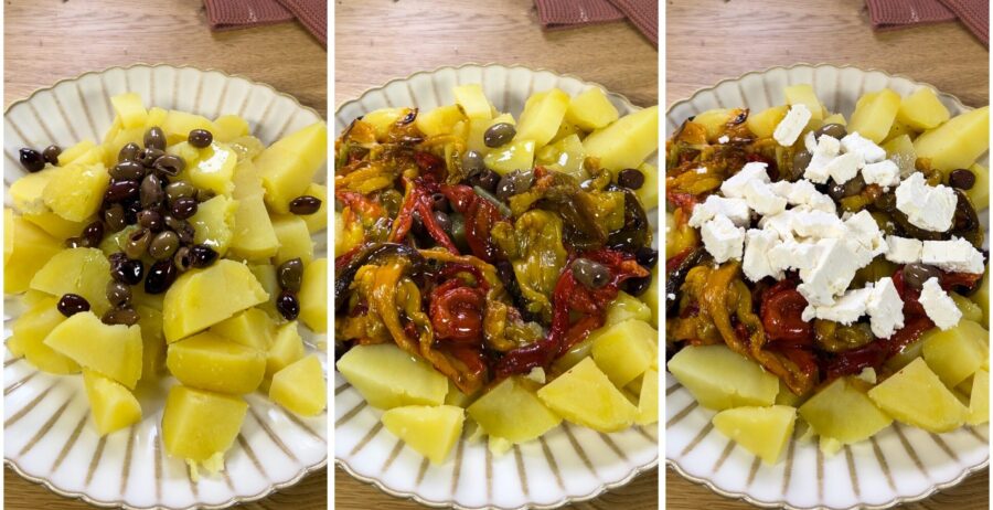 Schritte zur Zubereitung des Kartoffel-Paprika-Salats mit Feta und Oliven