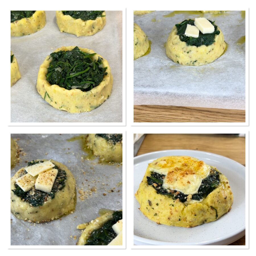 Formt die Kugeln so, dass ihr ein Hohlraum schafft, der die Füllung aufnehmen kann, und füllt sie mit etwas Käse, Spinat und nochmals etwas Käse (ich empfehle, den Spinat vor dem Verteilen etwas kleinzuschneiden – dann lassen sich die Törtchen besser essen).