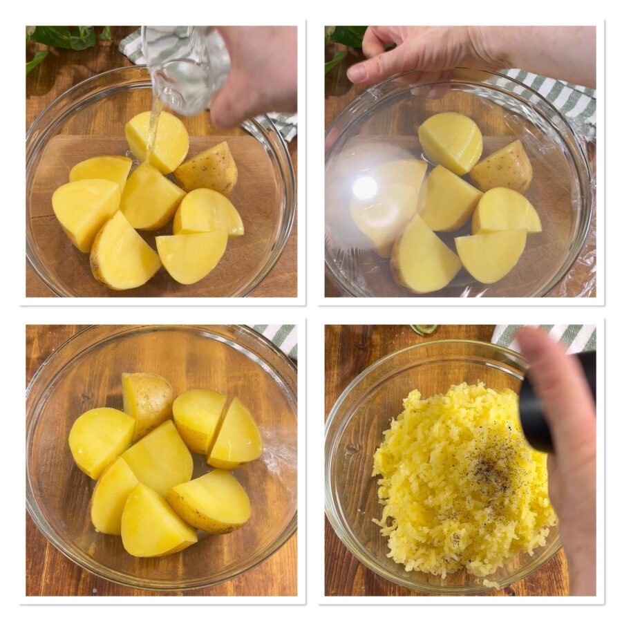 Kartoffeln abspülen, halbieren, in eine Schüssel geben, ein halbes Glas Wasser hinzufügen, sehr gut mit Mikrowellenfolie abdecken und bei 750 W für 10 Minuten garen. Alternativ die Kartoffeln ganz in einen Topf mit leicht gesalzenem Wasser legen und etwa 35 Minuten kochen, oder bis sie weich sind, wenn man mit einem Holzstäbchen hineinstecht.