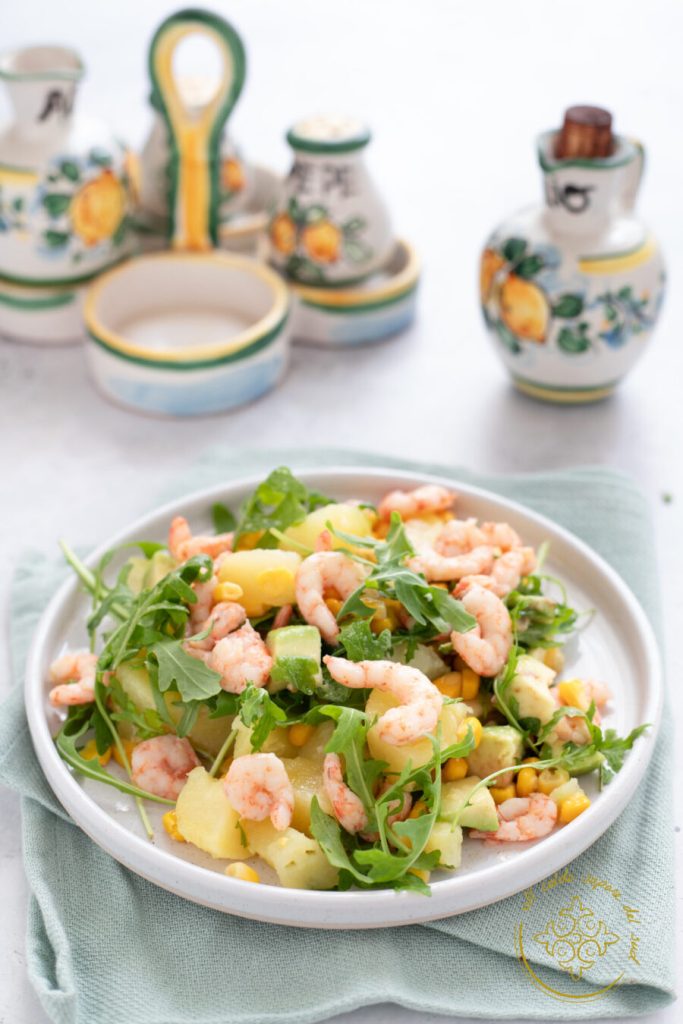 Dieses Rezept ist genau die richtige Lösung, wenn es wirklich heiß ist, ein gesundes Gericht und ein leichtes Rezept , das man im Voraus zubereiten und ganz entspannt zum Mittag- oder Abendessen genießen kann. Tatsächlich sind Salate in diesem Fall die passende Wahl und der Kartoffelsalat mit Garnelen, Avocado, Rucola und Mais ist ein perfektes, vollständiges Hauptgericht, das die ganze Familie zufriedenstellt.