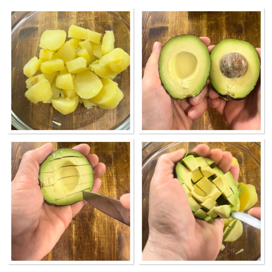Gebt die gewaschenen Kartoffeln in einen großen Topf, bedeckt sie mit Wasser, salzt und bringt es zum Kochen. Kocht sie etwa 35 Minuten oder bis sie sich beim Einstechen mit einer Gabel weich anfühlen. Abgießen und abkühlen lassen, dann für ca. 1 Stunde in den Kühlschrank stellen, damit sie beim Schneiden kalt und fest sind.