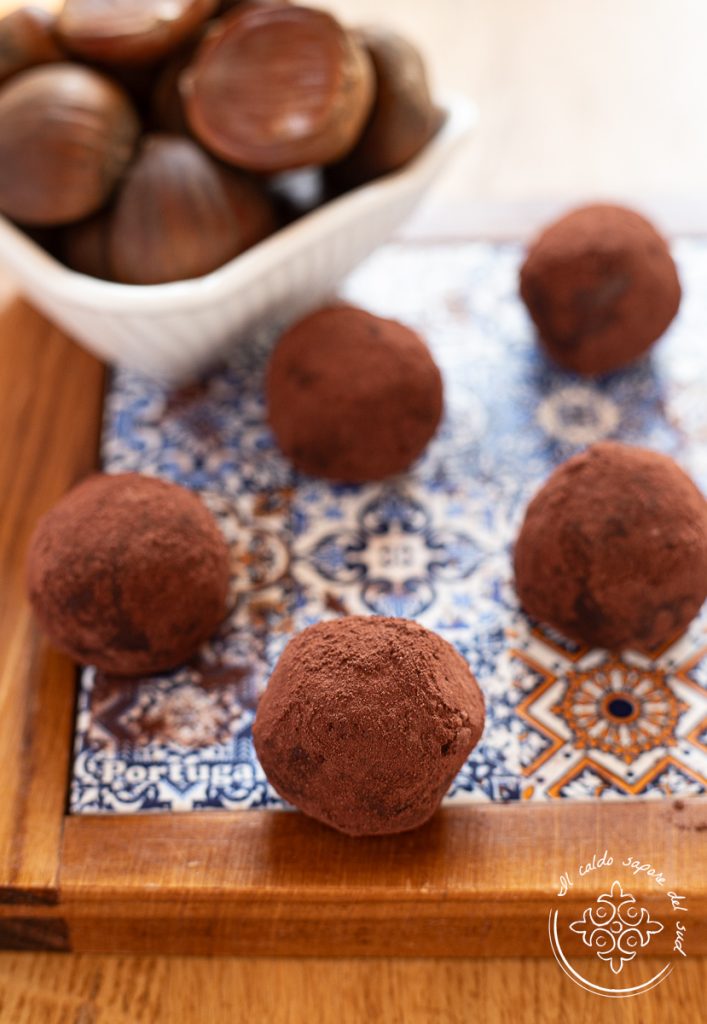 Kastanentrüffel mit Kakao, die herbstlichen Desserts, einfach, lecker und total verführerisch, perfekt, wenn Kastanien Saison haben, wie die Tarte mit Kastaniencreme und Zartbitterschokolade oder die Kastaniencreme mit Zartbitterschokolade. Die Kastanien-Kakaotrüffel sind kleine, feine Häppchen, sehr einfach zuzubereiten und richtig schick, auf Basis von gekochten Kastanien und Kakao. Der Teig ist derselbe, der auch dem Monte-Bianco-Dessert zugrunde liegt; sie sind wirklich unwiderstehlich und perfekt, um Gäste mit Desserts zu überraschen! Wollt ihr sie auch ausprobieren? Folgt mir in die Küche, aber bevor es zum Rezept geht, erinnere ich euch daran, dass ihr, wenn ihr über alle meine Rezepte auf dem Laufenden bleiben wollt, meiner Facebook-Seite (hier) und meinem Instagram-Profil (hier) folgen könnt und dass ihr hier weitermachen könnt.