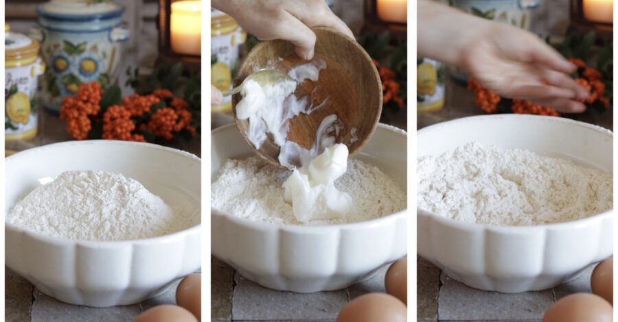 Um die Squisiti-Kekse aus Modica herzustellen, geben Sie das Mehl in eine Schüssel, fügen das Schmalz hinzu und vermischen alles miteinander.