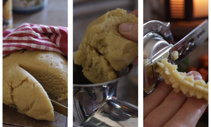 Ich empfehle, die Maschine zu verwenden und nicht den Spritzbeutel, da sich der Teig schwer von Hand extrudieren lässt. Für etwas aromatischere und bernsteinfarbene Kekse ersetzen Sie zwei Esslöffel Zucker durch zwei Esslöffel Honig.
