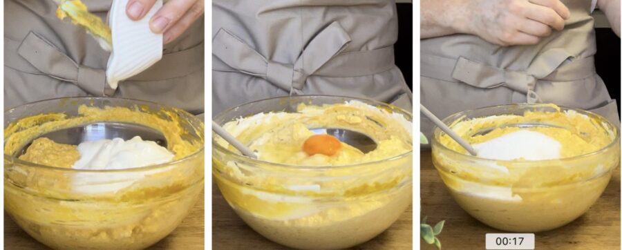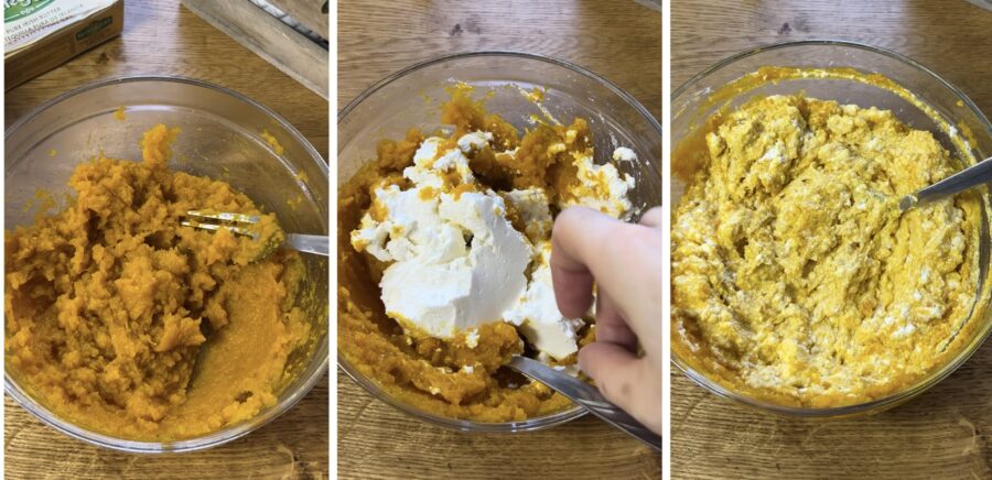 Den gegarten Kürbis schälen, 350 g Fruchtfleisch abwiegen und in eine Schüssel geben. Mit einer Gabel gut zerdrücken und dann die Ricotta unterrühren.