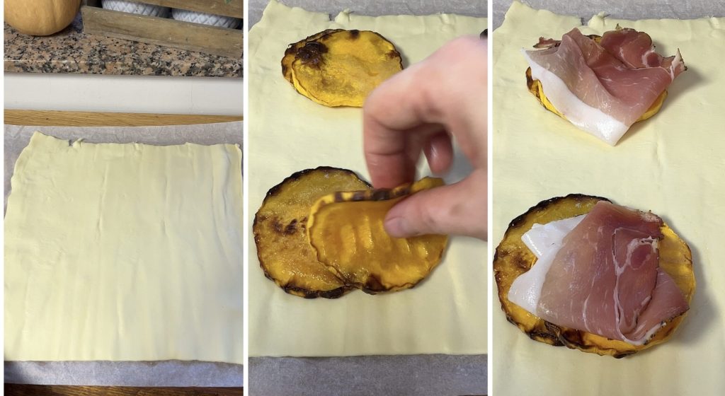 Legt die Kürbisscheiben so, dass ihr vier Rustici formen könnt, jeweils zwei pro Portion. Füllt sie zusätzlich mit einer Scheibe Speck und zwei Scheiben Käse.