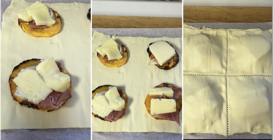 Mit weiterem Blätterteig bedecken und so zuschneiden, dass vier Rustici entstehen.
