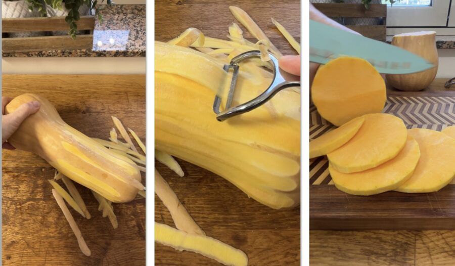Zum Garen des Kürbisses zuerst schälen, dann in etwa 10–12 Scheiben von ca. 0,5 cm (oder etwas dünner) schneiden.