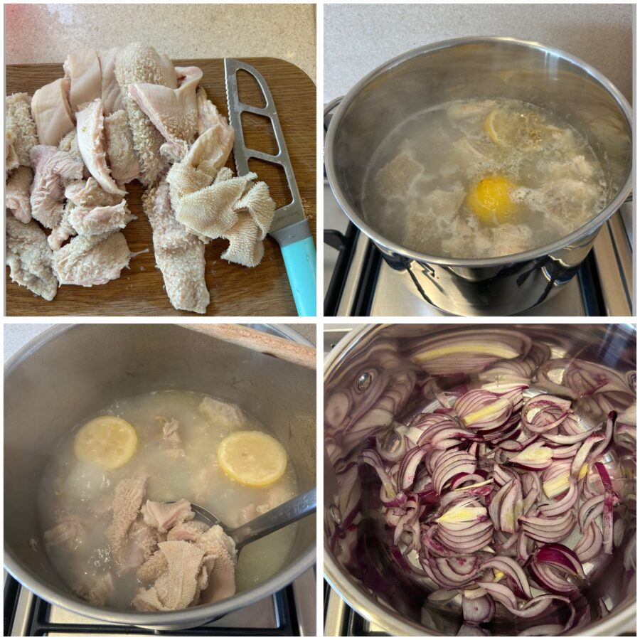 Das Kochen mit Zitrone macht die Kutteln milder, entfernt eventuelle starke Gerüche und reduziert einen Teil des Fetts. Es ist ein einfacher Schritt, der im Endergebnis einen großen Unterschied macht.