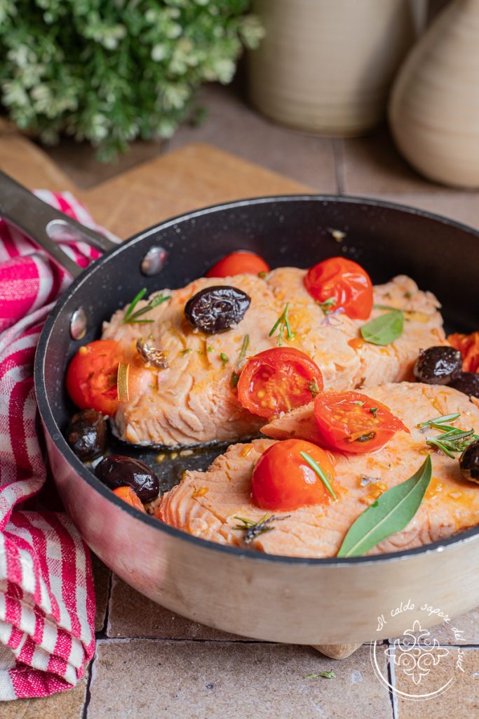 Lachs in der Pfanne mit Cherrytomaten, Zwiebel und Oliven, ein leichtes Lachsrezept, einfach und schmackhaft. Der Lachs in der Pfanne mit Cherrytomaten, Zwiebel und gebackenen Oliven ist ein köstliches Rezept, um Lachsfilets oder -stücke auf leichte und aromatische Weise zuzubereiten. Es erinnert ein wenig an Lachs nach mediterraner Art in der Pfanne, ist aber leichter und trotzdem köstlich, ideal wenn eure Diät Lachs vorsieht oder wenn ihr einfach ein leichtes Fischgericht genießen wollt. Wir haben schon viele Rezepte mit Lachs vorbereitet, wie Lachs aus dem Ofen mit Kartoffeln und Cherrytomaten oder Lachs aus dem Ofen mit Orange und Zitrone, aber Rezepte mit schnellen und raffinierten Lachsfilets gibt es wirklich viele und sie sind sehr lecker – und dieses hier ist zudem leicht.