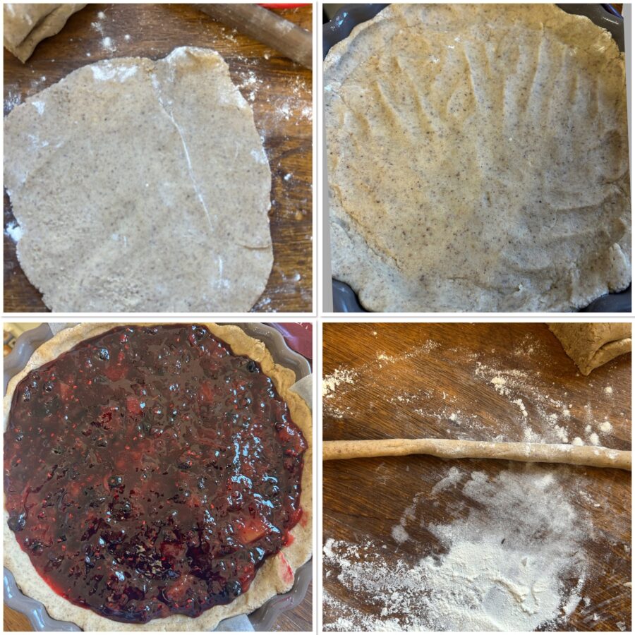 Nach der Ruhezeit den Teig kurz bearbeiten, damit er wieder geschmeidig wird, und etwa 2/3 (oder etwas weniger) davon verwenden, um eine Form von 24–26 cm auszukleiden.
