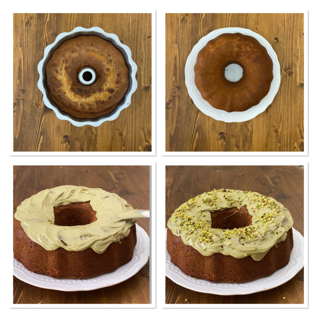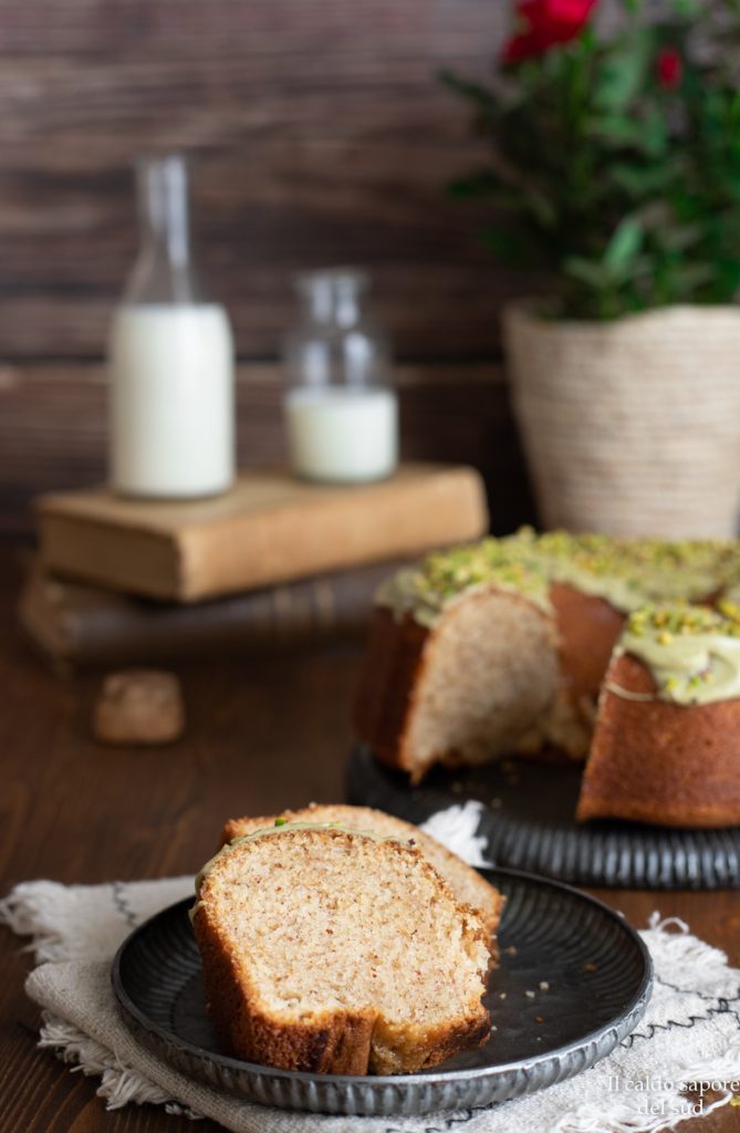 Lockerer Mandelkuchen mit heißer Milch und Pistaziencreme – ein extrem einfaches und köstliches Rezept, das im Handumdrehen fertig ist.