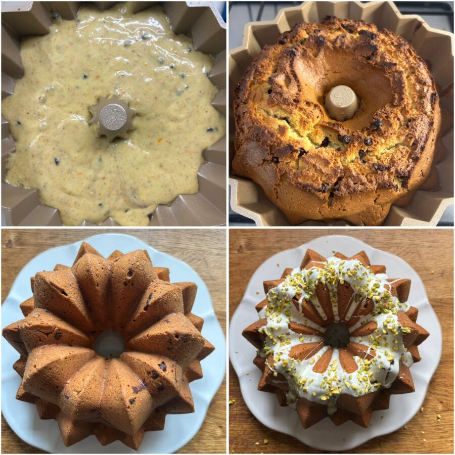 Füllt den Teig in eine gefettete und bemehlte Gugelhupf-Form (ich habe ein Trennspray verwendet) und backt bei 170°C für 40 Minuten. Macht die Stäbchenprobe, nehmt den Kuchen aus dem Ofen, lasst ihn kurz abkühlen und stürzt ihn dann. Bestreut ihn mit Puderzucker oder verziert ihn wie ich mit geschmolzener weißer Schokolade und gehackten Nüssen (z. B. Pistazien).