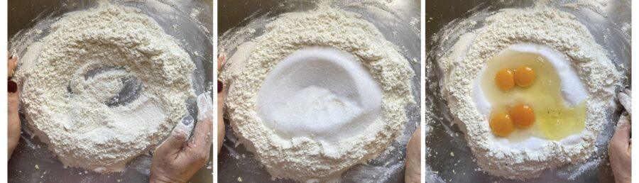 Um die Mandel-Cantucci zuzubereiten, formen Sie zunächst aus Mehl, Salz und Vanillin eine Mulde, geben Sie den Zucker in die Mitte und fügen Sie die Eier hinzu. Verrühren Sie die Eier mit dem Zucker, damit sich der Zucker vollständig auflöst, bevor er mit dem Mehl verknetet wird.