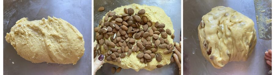Wenn der Teig fertig ist, geben Sie die Mandeln dazu und verwenden Sie einen Teigschaber, um den Teig von der Arbeitsfläche zu lösen und die Mandeln gleichmäßig einzuarbeiten.