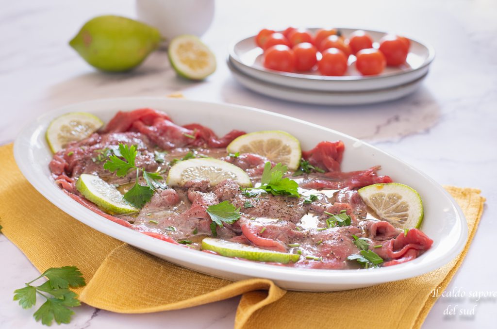 Mariniertes Rindercarpaccio mit Zitrone, ein leichtes und schmackhaftes Hauptgericht aus Fleisch, ganz ohne Garzeit.