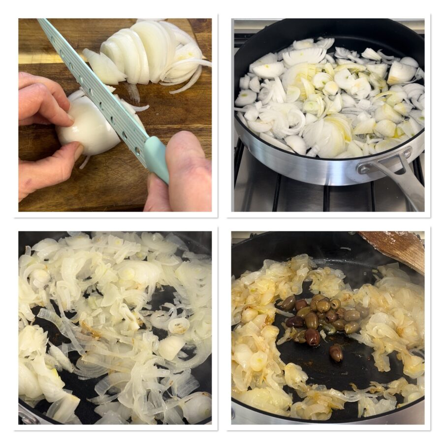 Während das Hähnchen brät, schält und schneidet ihr die Zwiebeln in Scheiben und gebt sie in eine große Pfanne zusammen mit einem halben Glas Wasser, Salz und Öl. Schmort die Zwiebeln mit Deckel, bis sie weich sind; dann nehmt den Deckel ab, lasst sie etwas anbraten und gebt die entsteinten Oliven hinzu.