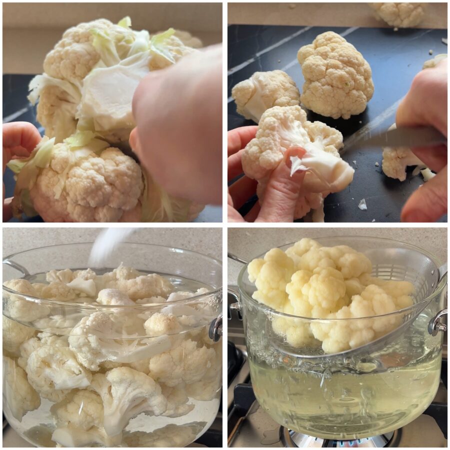 Tauchen Sie den Blumenkohl in leicht gesalzenes, kochendes Wasser und garen Sie ihn für eine Minute, nachdem das Wasser wieder aufgekocht hat. Nehmen Sie ihn mit einer Schaumkelle heraus und stellen Sie ihn beiseite.