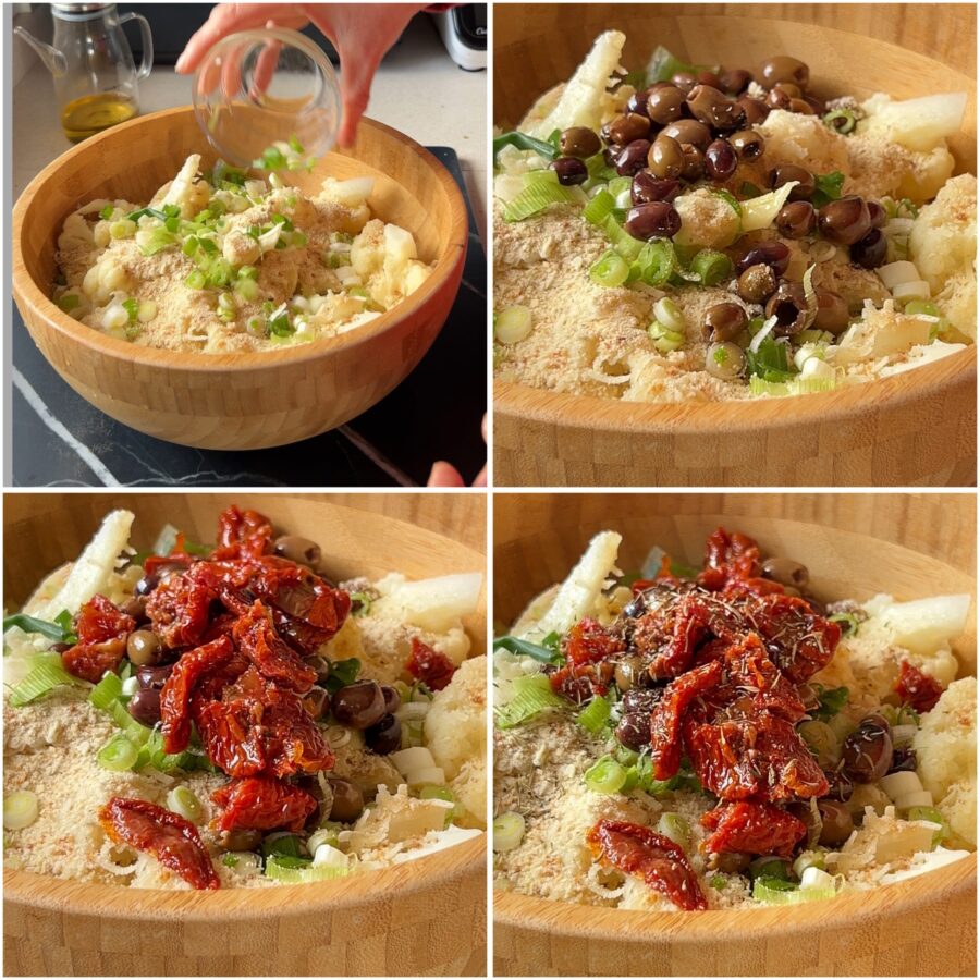 In dieser mediterranen Variante, schmackhaft wie auf sizilianische Art, aber anders als das klassische Rezept Blumenkohl und Kartoffeln gratiniert aus dem Ofen, werden unsere Gemüse zuerst kurz blanchiert und dann im Ofen mit extra nativem Olivenöl, Semmelbröseln, geriebenem Käse, Oliven und getrockneten Tomaten überbacken. Das Ergebnis ist ein goldbraunes, aromatisches und gratiniertes Gericht, perfekt als Ofengemüse-Beilage oder als leichtes einziges Gericht.