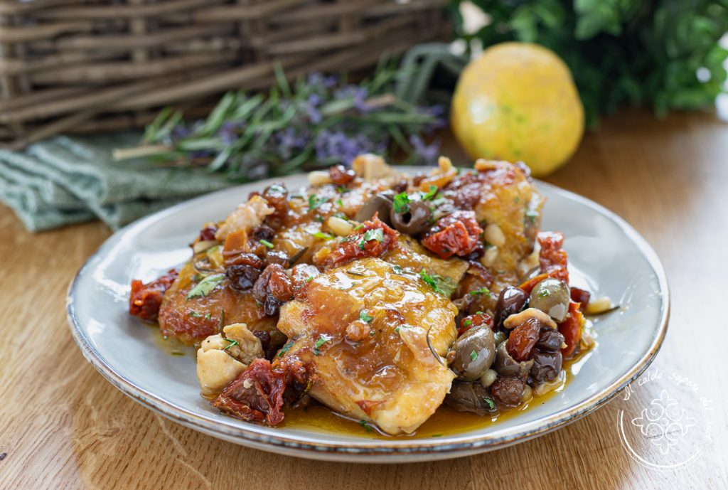 Mediterranes Hähnchen in der Pfanne, mit getrockneten Tomaten, Oliven, Kapern, Rosinen und Pinienkernen – sehr zart, saftig und mit einer köstlich goldbraunen Kruste. Perfekt, wenn du nicht weißt, wie man Hähnchen zubereitet, und genauso lecker wie Pollo alla cacciatora oder Pollo alla birra in casseruola. Wenn ihr ein einfaches Fleischgericht sucht, das günstig, zart, sehr lecker und raffiniert ist, dann müsst ihr dieses Hähnchen in der Pfanne à la mediterran unbedingt probieren. Wenige Zutaten, oft schon in unseren Vorräten vorhanden oder leicht zu besorgen, schenken euch ein duftendes, buntes und vor allem sehr köstliches Hähnchengericht. Wenn ihr wollt, könnt ihr auch die Hähnchenbrust mediterran mit Zwiebeln und getrockneten Tomaten zubereiten.