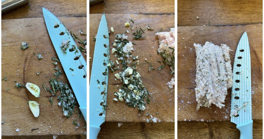 • Legt den Lardo kurz beiseite und hackt dann die bereits gereinigten und trockenen Rosmarinnadeln fein.