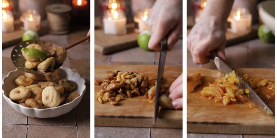Im Rezept findet ihr Schritt-für-Schritt-Fotos, entnommen aus einem Vintage-Style-Video, das ich vor einiger Zeit gedreht habe. Ich empfehle, die gesamte Trockenfrucht und die Feigen im Mixer zu zerkleinern, statt sie mit dem Messer zu hacken, wie auf den Fotos zu sehen – ich habe es zwar so gemacht wie auf den Bildern, aber püriert wird das Ergebnis feiner.