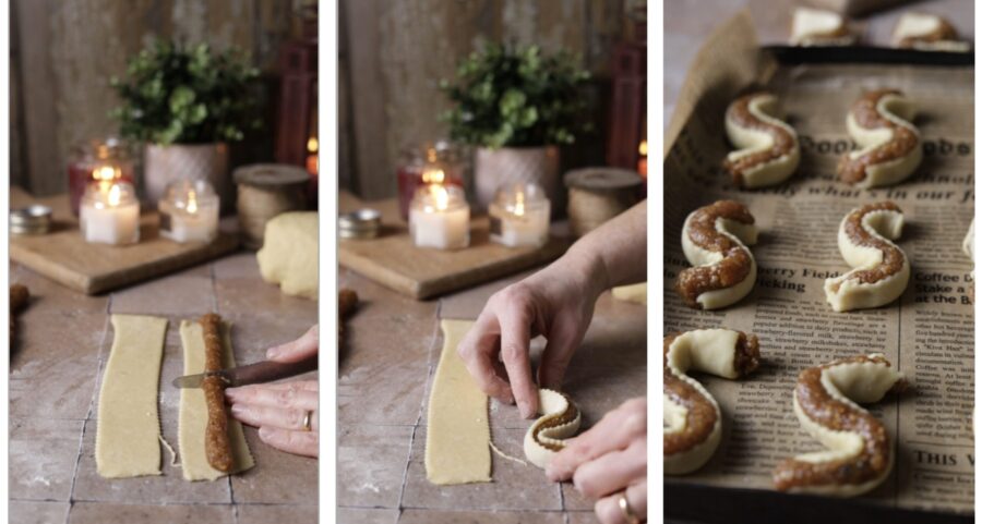 Nehmt den Teig aus dem Kühlschrank und rollt ihn auf einer bemehlten Fläche etwa 2–3 mm dünn aus. Mit einem gezahnten Teigrad schneidet ihr Streifen von 3–3,5 cm Breite, legt die Füllung auf den Teig und rollt so, dass nur die Seiten bedeckt sind und die Oberseite offen bleibt. Legt die Kekse auf Backpapier und backt sie im vorgeheizten Ofen bei 180°C für circa 20 Minuten oder bis sie ganz leicht golden sind.