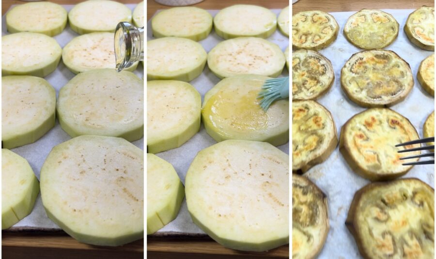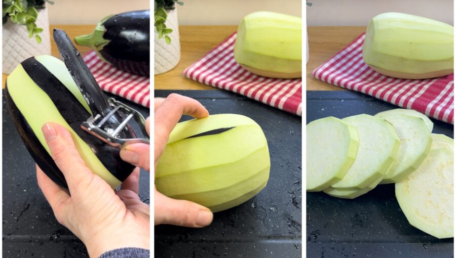 Spült die Auberginen, entfernt den Stielansatz, schält sie und schneidet sie in Scheiben, sodass ihr etwa knapp 1 cm dicke Scheiben erhaltet.
